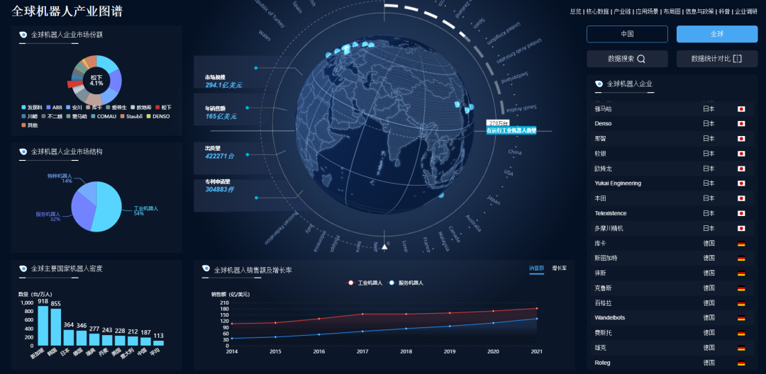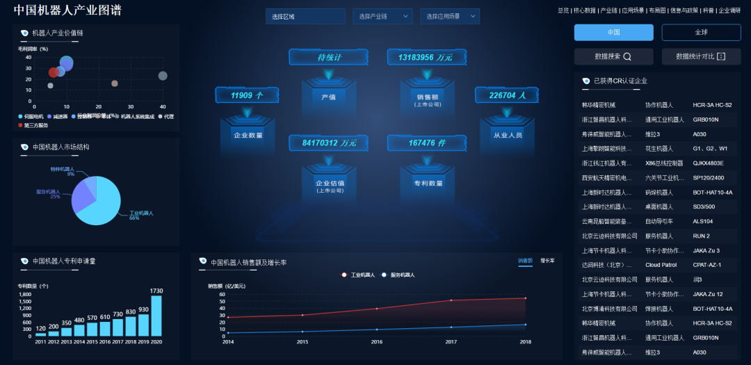 机器人产业图谱不仅涵盖了全球机器人产业宏观数据,覆盖核心机器人710公海寰宇企业市场份额占比、机器人市场结构、机器人销售额及增长率等系列宏观数据。而且展示了中国各省市机器人产业的详细情况,包含了机器人企业数量、专利数量、销售额、增长率、已获得CR认证企业数量等核心数据。